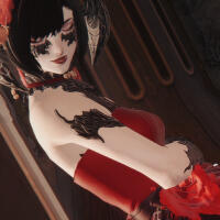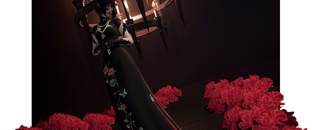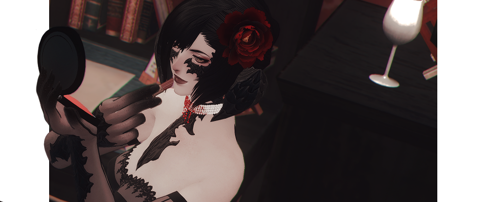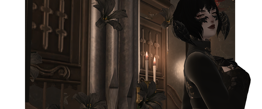 The evening drags onward into the unnatural evening. The feast is a carriage hitched to a ceaseless mare, the din of her cart echoing through the halls of the sprawling estate. Here, the voices crawl along portraits of bygone faces, moth-eaten and faded. The host who shares their blood lingers near the organ keys, prepared to add the bellowing gasp of his instrument to the cacophony. When he lowers himself to the bench, it is with all the grace of a man turning to the sheets. He seeks the same thing as he might in the bedstead. To see a thirst slaked. A hunger sated. Respite. His gloved fingers press down and the instrument groans with enough air to send a tremor through the walls. The first course.▊▊ To celebrate this endless night under the light of a waning moon is sublime. A flittering songbird slide’s her hand over the sturdy shoulders of our dear Count before she steps forward into the room and raises her glass. What a haunting note the organ brings, but it does not dare outshine the chanteuse. Her voice is pitched high, the tongue of Old Ishgardian spilling from her lips to greet the evening’s feast. Hollow and haunting ringing from her chest, inviting deep rich red to fill every glass.Once, so long ago, Ishgard had been laid beneath a shroud of shadow. Beneath the dark of night her gales seemed a death rattle. In truth, war brought upon the mountains an aetheric anomaly — a cover of grief so thick neither moon nor sun could penetrate it. The musician fluttered his fingers against the organ’s keys, not so different than how the fabled Viscount Faute had fluttered his against sternum and rib. Only blood could wash away the night, said the Viscount, and in the song did the cries of heretics rise. Uniform and shrill, the estate echoes a tale as old as its stone.▊▊ The rise and fall of her breath snakes through each ear and horn a hushed whisper. It’s utterly decadent, how the song drips from her lips and ghosts the sound of the Count’s melody. She sings almost like a warning bell, is it for the heretical cries? Or is it simply how the clock strikes the hour? It’s difficult to tell on this auspicious evening, when the Viscount’s plea so sweetly begs to be met. So drink, and gorge oneself to bask in blood.‘Twas just the beginning, this song. The count moves over ivory teeth of his organ, caressing them as he might the length between inner arm and hand. A caress, a libation. When the longest night comes across Ishgard now, once every seven turns, it is a feast in the torturer’s name that sends it running. So rich and sweet sounds does the musician spill, his trencher of music offered out to his guests. His decrescendo is the wine that passes over the tongue of his chanteuse, filling the dark manor with an intoxicated demand. Run headfirst into the night — chase at its heels with desire. Let intemperance be the lantern.▊▊ Please, she requests in tune, in a language long left to rest, let the red stain your lips as wonderfully as it does hers. This song is only the start after all, and the night will only continue to grow long. Our indulgent musicians will not ask twice, so do not disappoint. The songbird’s voice weaves under and over the ribcage of the organ’s sound; there is no competition to be heard during this celebration, only a complementary waltz. Let them dance round and round, buried within the chest, flowing through every vein.It is but a taste. Only enough to fill an ear, a horn, a mouth for a moment. And then it is gone — swallowed. It sits in the soul like a stomach, ready to be carried through the body. The musician stills his hands over last note and allows his organ its final breath. When at last the lingering sigh of sound fades, he stands and he smiles. It is a mask of satisfaction reserved only for himself. When outward does his gaze pan, it is leaden with his own drought in need of wetting. Perhaps, like the fable supposed lifetimes before him, he would be liable to turn to a neck rather than chalice that evening.▊▊ She sighs breathily, a wistful look on her face and as the eerie organ fades, so does their harmony. Of course, she does not dare take part in such heresy the stories speak of, but what a romantic thought, to take the entire evening to relish in red. Peony swirls the remains of her glass lightly, the curl of her vermillion lips seen over the rim of the crystal as she takes a sip. Bonne Fête de Faute, dear listener.