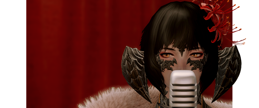 Peony steps towards the stage, heels clicking against the hardwood. Despite the fact that she is not a performer, she does her best to hold herself with the grace of one. There are no opening words, simply deep breath and a soft hum. Peony's voice starts low, more audible than a whisper but just as startlingly haunting.For some, it may take a few notes or more to realize she is not singing in Eorzean at all. A well-tuned ear will recognize the tongue, for Peony is singing in Doman tonight. Her breathy voice clings to every syllable, floating throughout the room.The silks of her dress start to sway with the gentle movement of her hips, leaning her body into the sound. Peony's eyes travels the room through dark lashes, locking a piercing gaze with any who look at her, no matter how fleeting. Even if for just a second, her attention is yours.Her voice rises and falls, a bittersweet melody. For those familiar with her words, she sings of the changing of seasons, the turning of leaves. Peony's song forms around the thoughts of sweet summer memories and the cold loneliness of winter's chill.And as certain as the winter turns into spring, her song shall inevitably come to an end. Peony starts to trail off into soothing vocals, descending into the familiar low hum she started with. Her lips curl around the last note, a small, satisfied smile. She bows, ever so slightly, and takes her leave to enjoy the rest of the evening.